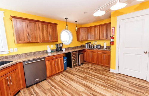 Top Level: Great room with gas fireplace, flat-screen TV and deck access. Kitchen with breakfast bar seating 2 complete with beverage cooler and ice-maker and the dining area seating 4-6. Workout area with Peloton bike and free weights, half bath and a Bedroom with a Bunk Set and Trundle.
