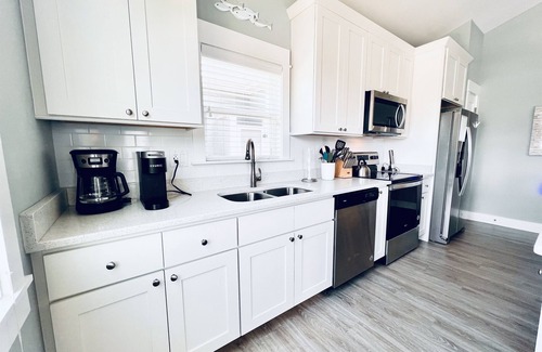 This beach retreat was built in 2020 and still looks and feels brand new. Shore Daze is decorated with high-end beach decor and finishes. As you enter the cottage, you step into an open concept living room and kitchen area with vaulted ceilings. The fully equipped kitchen boasts stainless steel appliances, sparkling quartz countertops, an island to seat 6 people, and a Keurig. There is a gas grill and outdoor seating available as well.