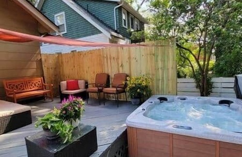 Private hot tub with free parking and king bed and queen bed in professionally designed and updated entire house! Unbeatable location on a quiet street. Relax in the garden spa, then a 2 minute walk to all the best restaurants and night life of downtown Royal Oak! Entire property is available for your use!
