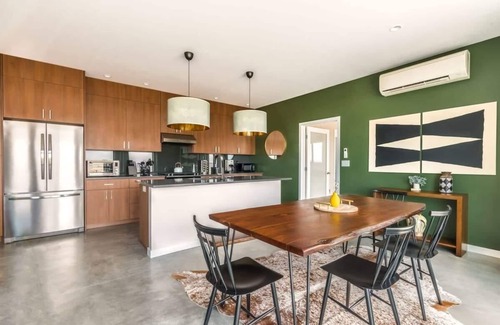 Off-grid elegance meets panoramic desert views at Estrella Perdida, a stylish, solar-powered retreat perched on 5 acres in Joshua Tree. Just a short drive from downtown, this design-forward home features outdoor cold-soak tubs, a fire pit, and floor-to-ceiling views that capture the magic of the high desert. Whether you're soaking in the sun or dining under the stars, this peaceful escape offers space, silence, and sophistication just minutes from the park. The home's architecture is inspired by the original homestead cabins of the area, incorporating warm earthy tones for a modern yet natural feel.