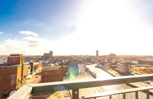 Here you reside at the top of the 9th and 10th. Floor in one of the most exclusive buildings at the port of Wismar. The tastefully furnished 3-room apartment is easily accessible via the lift. Here can spend up to 6 people on 115 m² a fantastic holiday. The view from the large roof terrace is simply amazing. Here you can look over the beautiful old town and the harbor. The living / dining area with TV is modern. The cleverly integrated kitchen is fully equipped with dishwasher, microwave, coffee maker, kettle and much more. The 2 separate bedrooms ensure restful nights. The bathroom with shower is very elegant. On arrival 2 beds are made and towels are ready for you. WiFi is accessible without cost. Public parking is available in the immediate vicinity