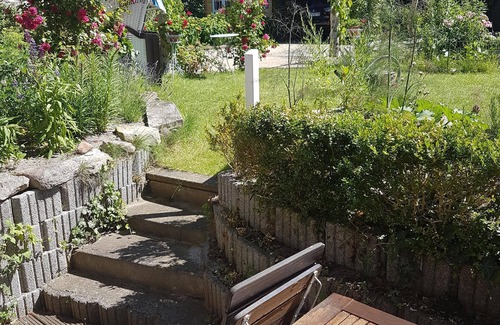 The lovingly furnished apartment with two bedrooms, a baby bedroom with a cot, a fully equipped kitchen (stove, microwave, coffee maker, dishwasher, kettle) and a bathroom is located on the quiet south side in the basement of a two-family house.