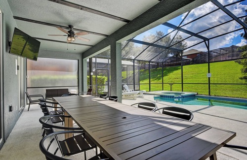 [PRIVATE POOL & SPA] Our backyard boasts a covered porch, large, heated pool and spa all under a connected Lanai to provide the ultimate Florida backyard experience! The property is south facing so will receive a large amount of sun through the entire day. A large Smart TV is mounted on the wall to enjoy the big game or must-see events while enjoying the backyard. Plenty of seating is available including loungers for those sun worshippers in your group! There is a pool safety fence that is set up for your arrival that is not in the pictures.
