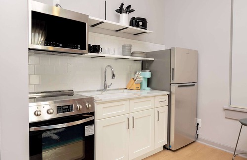 The modern Murphy bed system allows the living area to transform effortlessly into a restful sleeping space, while the eat-in kitchen is perfect for both quick bites and relaxed meals. A spacious en-suite bath completes the setup, giving you everything you need for a seamless stay.