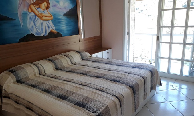 It has 1 large bedroom with super king box bed, private bathroom and balcony with beautiful view of the site. 2 bedrooms furnished with bed, nightstand, wardrobe and 2 beach chairs and shared bathroom. A garage for one car and open parking for two others. Spacious room with chairs and table. Kitchen with freezer, fridge, microwave, stove, sink, pots, kettle, plates and cutlery. A large garden with weir, orchard, and hiking spot.