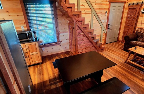 The horse-themed cabin, The Windstorm sits on a ridge in the Ozark mountains just outside of Marshall, Arkansas. An RV pad with water-electric-sewer is adjacent to the cabin so for larger groups, bring your RV (RV pad rent is additional) From the front deck a beautiful view of the Ozark mountains can be seen. Having the amenities of home, you will find it extraordinarily comfortable but secluded enough to get away from the hustle-bustle of the city. It has a 3/4 bathroom with a walk-in shower, a two-person Jacuzzi tub on the deck, a loft with a queen bed and a sofa-sleeper that opens into a queen sleeper with a memory foam mattress. The kitchen has a two-burner cooktop, dishwasher, microwave, air-fryer/convection oven combo, coffee maker, and apartment sized fridge with an icemaker. A full-size washer and dryer are also available. The climate is controlled with a dual zone, mini-split AC/heat pump but also has an infrared fireplace heater. Outside you can enjoy the spacious 12' x 16' gazebo (covered pavilion) with a large fire pit next to it and a large enough covered BBQ grill to host a family gathering. The main attraction to the area is the beautiful, scenic Buffalo River that is famous for its one-of-a-kind float trips. The area is loaded with lots of activities for the outdoor enthusiast!
