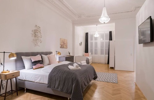 Experience the atmosphere of an authentic old Viennese “Altbau” building in our Palais Schottentor Apartment. This luxurious space has all the characteristics of a traditional construction, including high ceiling and large windows offering stunning views onto the neighbouring Altbau-architecture, with all the modern amenities you may need. With a spacious size of 160 square meters, this bright and airy gem of an apartment offers ample space for up to 10 guests. Three comfortable double beds and two single beds are spread out over three bedrooms. The fully-equipped kitchen enables you to enjoy a home-cooked meal before or after a day of adventures and exploring the city. This meal can then be enjoyed at the beautiful dining table, which is a part of the spacious living room area. The luxurious bathroom is equipped with a bathtub, shower and a washing machine. The lovely apartment has been decorated with love and attention to detail, combining traditional baroque styles with modern luxury, and invites you to relax, enjoy and take in the architecture and views around you. WIFI is available and provided free of charge through out the apartment. Airport shuttle can be arranged upon request.