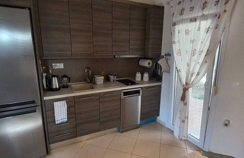 This new 2br residence of 60m2 is located in a very quiet residential area of Nikiti, less than 5 minutes walk to one of the most beautiful beaches in Chalkidiki. The ground terrace in front of the private garden is the perfect spot to relax and enjoy meals outside with family and friends The house features a comfortable living room with a flat TV and a fire place, 2 double bedrooms and a bathroom with shower cabin.