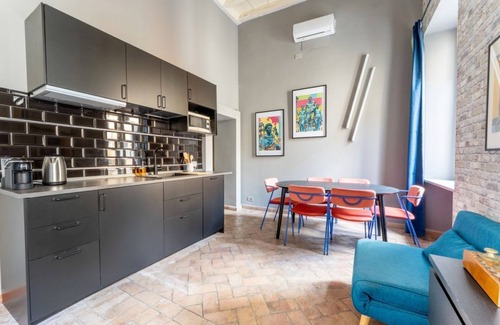 Steps from the Pantheon, this apartment blends history and creativity in a space designed for families and groups of up to eight guests. Located in a historic building on the second floor, it offers three double bedrooms each with a private bathroom, a fully equipped kitchen, and a bright living room with sofa bed and fourth bathroom. The décor playfully reinterprets ancient Rome in a pop, contemporary style, with vibrant colors and witty details. Every space is designed for sharing moments, cooking together, or relaxing after a day exploring the city.