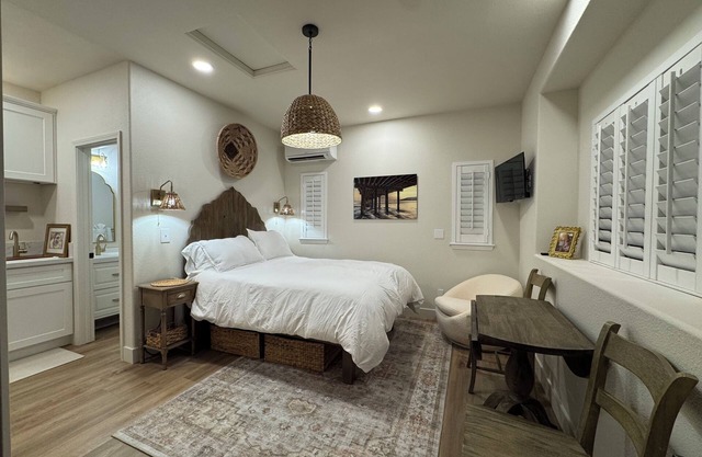 Sleep soundly in the second suite, featuring a queen bed, smart TV, direct patio access, and an en-suite bathroom with a walk-in shower.