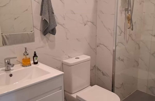 * Sleek en-suite complete with bath and Caesar stone topped vanity