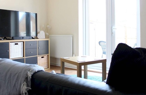 The first bedroom at the top of the stairs is a double bedroom, with a chest of drawers for guest storage. The bedroom has its own TV and overlooks the back garden.