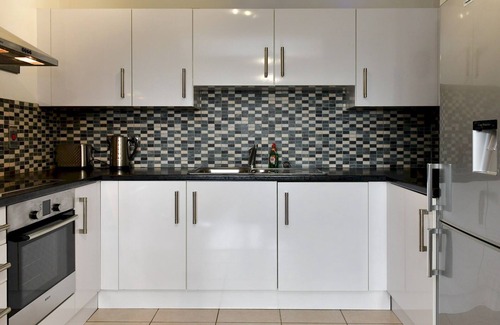 🍽 Fully Equipped Kitchen – Sleek white cabinetry with oven, hob, fridge-freezer, microwave, and all the essentials for cooking at home