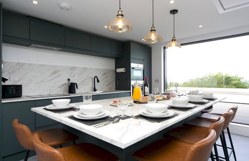 The showstopper open-plan kitchen and dining area features a glass wall that runs the length of the property and opens out to a decked roof terrace with more gorgeous sea views! All of these features come together to create a seamless inside-outside space.