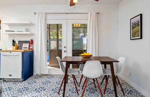 Updated & newly furnished, this home boasts a simple sophisticated style. Cozy living rm, large kitchen, memory foam mattresses & pillows. New tile floors in kitchen & bathroom. Bathrm has an AWESOME additional heater. Front yard sitting area w/ view! Terraced backyard w/ Fire-pit, BBQ, couch & chairs to sit under a string of lights, a billion stars & an enormous Oak tree--Great place to have a glass of wine amidst the evening hues shining through the trees. Dine in or walk (1 mile) to Downtown.