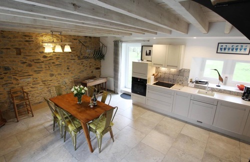 Detached house. Ground floor: Fully equipped kitchen (dishwasher, induction hob, oven, microwave). Living room with wood stove, comfortable sofa bed, large flat screen TV (satellite). Shower room with toilet, washing machine (dryer available in an annex). Upstairs, bedroom 1 (160x200 bed) and bedroom 2 (1 140x190 bed and 1 90X190 bed). Shower room with double sink and toilet, landing with desk. Baby equipment on request (cot, bath, stroller, high chair, changing mat, potty). TV. Wi-Fi internet. Sheets provided and beds made on arrival. Linen provided. Cleaning service included. Electric heating included (except electric car charging). All charges included. Wood provided. Enclosed and wooded garden. Terrace. Garden furniture. Sun loungers. Barbecue. Outdoor games (ping-pong, shuffleboard, pétanque, Finnish bowling, etc.). Storage for bicycles or motorcycles. "Au Fil de l'eau" is a true haven of peace, an exemplary harmony between authenticity, comfort, and contemporary decor. Located in the heart of a quiet and picturesque village (famous for its brioche), nestled in the greenery of its vast landscaped garden, the tranquil south-facing terrace for gourmet breakfasts, the whitewashed stone walls, the wood-burning stove, the magnificent contemporary staircase crafted by a local craftsman, the freshness of the colorful fabrics... not to mention the delightful welcome from Françoise and Thierry, its neighboring owners! Incredible charm and perfect harmony.