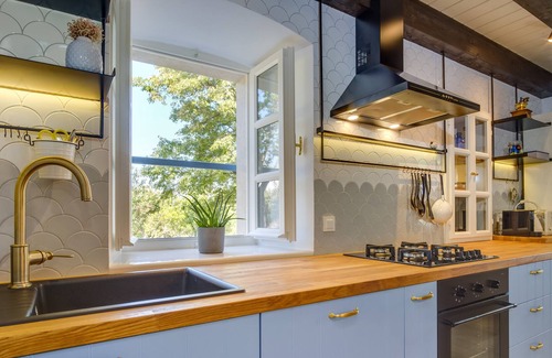 This secluded holiday home also features an attic bedroom with a queen bed, an additional sofa bed, and a lounge area with LED TV, all below high sloped ceilings.