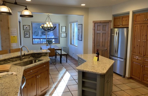 Inside, you'll find a delightful combination of contemporary flair and rustic mountain charm, with tasteful furnishings and thoughtful amenities throughout. The main living area is open, bright and airy, with vaulted ceilings, exposed beams and huge windows overlooking the mountains. There is a beautiful two-story fireplace, plenty of comfortable seating and a 55 inch flat screen TV. It's the perfect setting for family conversation, entertainment, or just relaxing after an exhilarating day of skiing, hiking or biking. Step outside on to the large deck and slip in to your private hot tub or fire up the gas grill.