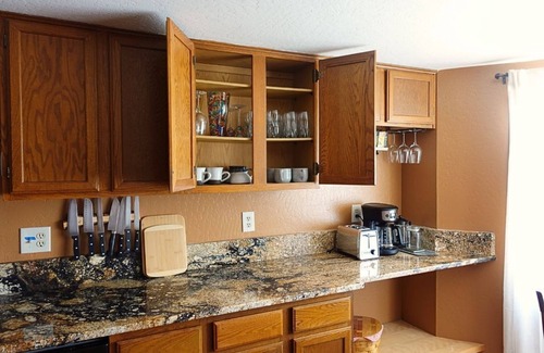 We have a fully stocked kitchen with new appliances, breakfast nook, bar seating, and a coffee bar with drip coffee and a French Press. Fresh coffee beans and a variety of teas are provided to ensure our guests can start their day off right.