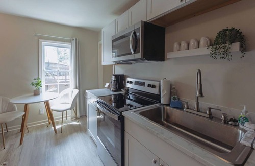 The apartment features a modern farmhouse chic design, ensuring a comfortable and stylish stay. Thoughtfulness and care go into every design element and item, creating a space tailored for a 5-star guest experience. Plus, this property is pet friendly, making it a great choice for those traveling with furry companions.