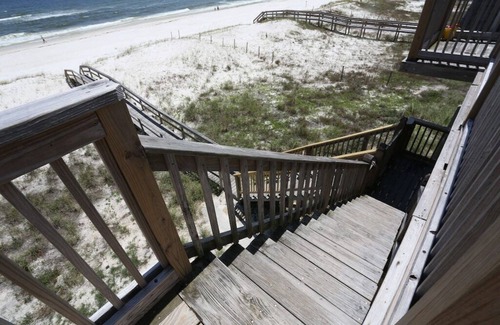 There are four sets of sliding doors for accessing the large deck. The deck has a large picnic table with seating for 8, plus chairs, and loungers for you to enjoy. This deck has a magnificent view and is great for soaking up the Florida Sunshine. It feels as if you are on your own private beach. The deck is private and encompasses the top floor. There are stairs off the deck to take you directly to the boardwalk and out to the beach. There are miscellaneous boards, floats, and beach toys downstairs by the garage.