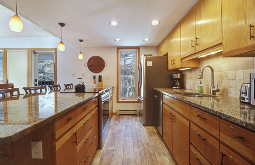 This beautiful and recently updated 2-bedroom condo overlooks Ten Mile Creek and is located just a few blocks from Main Street Frisco. It boasts all the amenities needed to enjoy a mountain getaway, including a wood-burning fireplace, a deep soaking bathtub in the master bathroom, a washer/dryer, a garage, and several decks overlooking the creek. The full kitchen has all the appliances and utensils one would need to entertain.