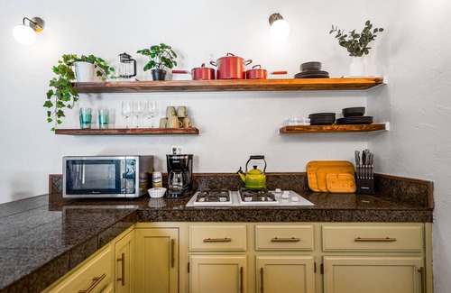 The entrance to the guesthouse brings you into a high beamed ceiling, fully stocked kitchen with easily accessible dinnerware. High-top seating is provided to enjoy kitchen socialization or a quick meal. Please be aware there is a stove, but no oven.