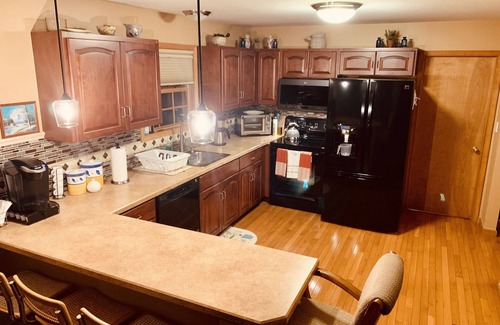 Fully equipped kitchen, including Coffee Machine, Air Fryer, Convection Toaster Oven, Large Instant Pot, Ninja Mixer, Keurig Coffee Machine and Stainless-Steel Appliances.