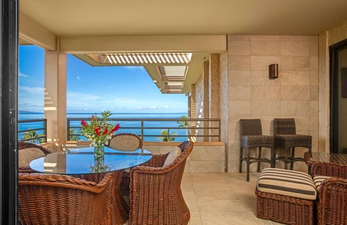 Corner glass windows frame stunning ocean vistas that extend southward toward Makena, creating a picturesque backdrop for relaxation. The private ocean-view lanai invites in the gentle tradewinds and presents an exceptional panorama that includes not only the ocean and pool but also the lush green slopes of the majestic Haleakala.