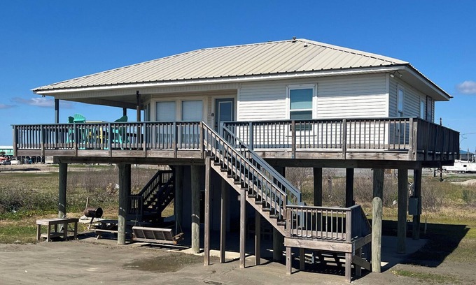 This beachfront camp has 2 bedrooms, 2 baths and sleeps 12. The covered deck provides a great view of the Gulf of Mexico. There are hardwood floors throughout, a washer, dryer, streaming TV and wireless internet. Underneath is concrete with a swing, fish cleaning area, and storage area. There is a charcoal barbecue. The kitchen has a gas stove and oven, refrigerator, dishwasher, microwave, coffee maker, toaster, pots, dishes, glasses, and utensils.