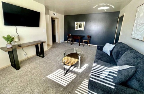 Cozy Living Space: Unwind in a well-designed living area that radiates comfort and relaxation. Furniture includes: Smart TV, couch, coin-operated washer and dryer accessible in the building (lower level).