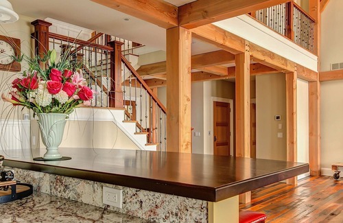 A large, over-garage loft features rustic wide - plank oak flooring, exposed beams and knotty pine siding. The room features a massive oak bed and ensuite full bath with quality appointments consistent with the rest of the home.