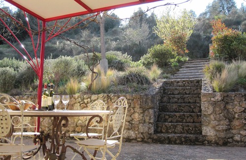 The house features a comfortable vine-clad patio facing a beautiful flower garden at the foot of a hill with olive trees inviting for relaxing outdoor leisure.