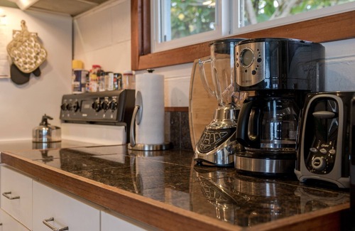 Creature comforts include: Mini-split air conditioner, WiFI, and wireless Sonos music system that streams music of your choice. TV shows and movies streamed via Netflix. Lighting is all dim-able low voltage halogen. Bedroom features a pillow top King bed with plush hotel quality sheets and overhead ceiling fan. Tiled shower with 4 sets of towels provided. Large ceiling fan in the great room circulates the cooled air. With the air conditioner, you can keep the windows closed to minimize road noise and salty air. Portable gas barbecue for grilling. Fully stocked kitchen with externally vented hood allows you to cook, eat in, and feel at home.