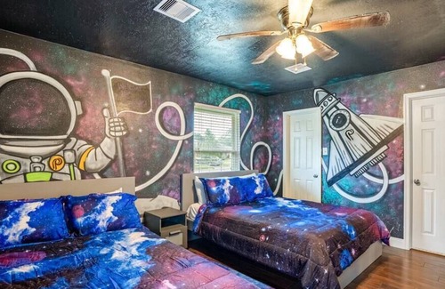 This Prolific Theme House is one of its kind! From the unique decor throughout this home, basketball court, and spacious backyard, you can never get bored! Whether you want to shoot content, have fun or visit your favorite attractions in Houston, you can’t go wrong with this Prolific Themed Home! Less than two minutes from I-610 a major highway and 15 minutes from all of the biggest attractions Houston has to offer, this house is an experience you don’t want to miss!