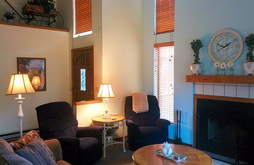 Spacious 2 bedroom 2 bath condo with wood burning fireplace. Fully stocked kitchen with full size refrigerator, range, microwave. Dining room with table that seats six, private deck with barbecue, private garage with remote, upstairs with full bathroom and twin beds, free high speed internet, flat screen tv's in bedrooms and living room (dvd player), beautiful landscaping with tall pines and stream and ponds.