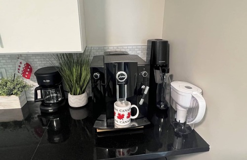I’ve meticulously stocked the kitchen… kettle, microwave, plates, glasses, and cups are yours to use. And for you coffee lovers, there are three different coffee makers to choose from.