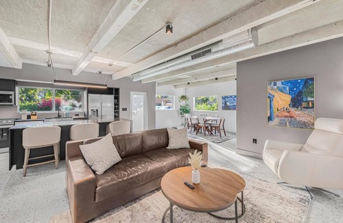 A refined balance of tranquility and urban accessibility, this modern residence is an architectural gem in Miami’s sought-after Coral Gate neighborhood. Designed with contemporary elegance, the home features exposed concrete elements, soaring industrial ceilings, and a seamless blend of modern aesthetics with warm, inviting details. A carefully curated selection of artsy furnishings complements the sleek interior, creating an atmosphere of understated sophistication. Expansive windows flood the space with natural light, enhancing the open-concept layout and providing a seamless connection to the surrounding greenery.