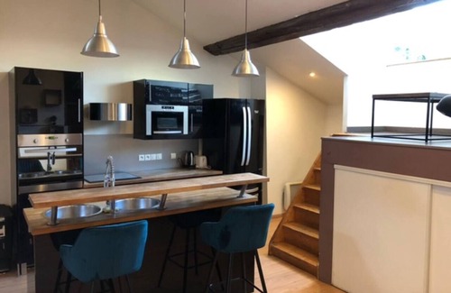 Located at the bottom of the Fourvière hill, this beautiful, comfortable air-conditioned apartment with its 2 bedrooms and 2 mezzanines for 8 people will offer you ultra-privileged access to all the historic sites of this unique district of Lyon. The Old Lyon district is a must in Lyon with its Renaissance architecture and its Traboule families, its many typical restaurants and friendly bars! spend unforgettable moments in the capital of Three Gauls. LPA car park -Saint Jean You arrive through an entrance hall which leads to the fully equipped American kitchen and a dining area with a large table for 8 people. 2 closed bedrooms are on the right, fully air-conditioned, the bathroom with WC is on the right of the kitchen. 2 mezzanines with double sofa bed complete this beautiful accommodation, from which you will see the Fourvière Basilica! equipped with a latest generation wifi 6 fiber box with more than 400 television channels. LPA parking - Saint Jean at the foot of the building 2 towels per person are provided with this accommodation (1 large bath towel and one facial towel). a code will be provided to you after booking building without elevator. 6th floor A key box allows free entry. Sloped bathroom not recommended for tall people LPA parking - Saint Jean at the foot of the building metro st jean old lyon line D Towels are provided with the accommodation at the rate of one large bath towel and one small face towel per person.