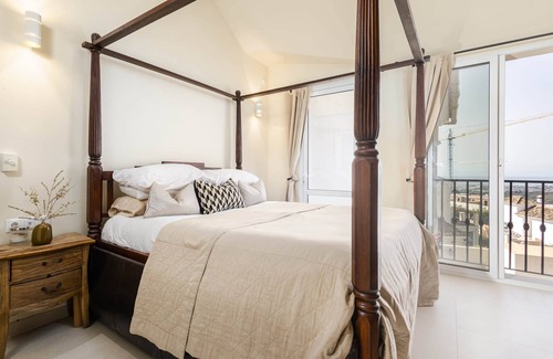 The master bedroom offers a king size bed (four poster bed), fantastic views through the south west facing windows of the sea, plenty of wardrobe space, and an ensuite bathroom with bath and shower. On this floor guests will also find; the fully equipped open plan kitchen, providing all the utensils and appliances expected of a luxury rental property, and breakfast island with seating for ; the spacious living room, complete with smart TV (Netflix and Amazon Prime); and 2 large terraces, one with alfresco dining area and coal and gas BBQ, and the second with more relaxed seating. The terraces wrap around the exterior of the villa, and provide absolutely stunning views from every angle.