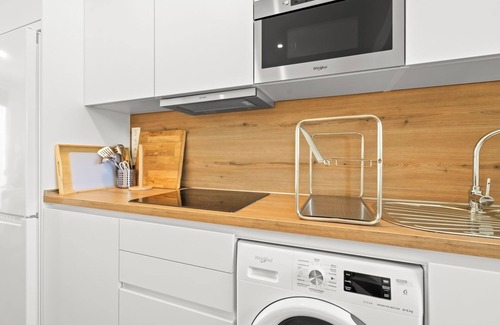 This stylish apartment features two well-appointed bedrooms, each designed for comfort and relaxation. The master bedroom includes a double bed, while the second bedroom offers two cozy twin beds, making it perfect for families or friends traveling together. Both bedrooms share access to a bathroom with double wash basin and walk-in shower.