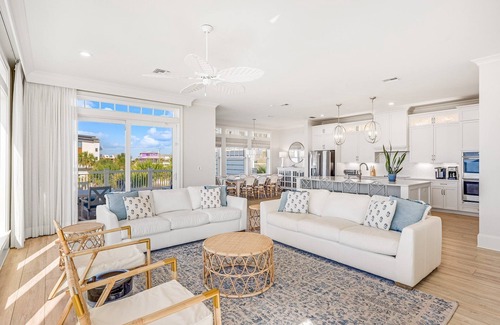 At Manly's Beach House, your private pool is located on the second floor deck just off the living/dining/entertaining area. The kitchen has everything you need with double ovens, an air fryer, large cooktop, large refrigerator, microwave, crock-pot, blender, Lenox dinnerware, and Green Pan cookware. Commercial grade Keurig coffee machine and coffee pot. The dining area is appointed with a large table overlooking the pool and Gulf, with additional seating at the island and on the deck. The wet bar includes a sink, wine cooler and dual refrigerator drawers for all your beach beverages. All dinnerware/cookware/glasses/silverware are provided in the home.