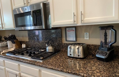 Fully functional kitchen with double ovens, air fryer, slow cooker, pressure cooker, rice cooker, blender, toaster, coffee maker (both Keurig and traditional). Dining table for 6, and 4 bar stools at island.