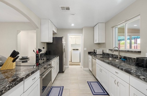Kick back at this stylish 4BR/3BA home in Mesa! Featuring a cozy boho vibe, a heated pool, hot tub, Roku TVs, outdoor games, grill, and 1gbps Wi-Fi — it’s perfect for families, groups, or business travelers. Includes a game room, work desk, pack ’n play, and more. 20 mins to Scottsdale & Phoenix!