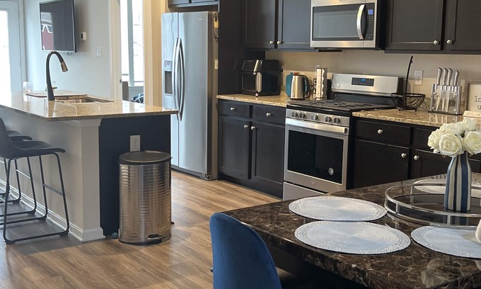 Large den upstairs is perfect for family time or movie night. Enjoy an open-floor plan with master suite on the first floor, powder room, laundry, garage with electric car outlet, and backyard patio. Home is equipped with electric charging station in the garage. Microwave, blender, Coffee maker, Toaster & Toaster Oven, Dishwasher, Washer/Dryer. No smoking and no pets allowed.