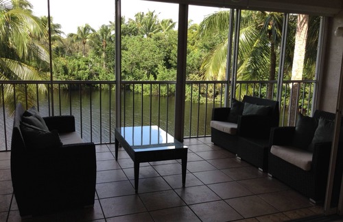 The contemporary condo is upstairs with vaulted ceilings and has 3 bedrooms with 2 full baths. The bedrooms have a king bed with bath (master), a queen bed, and 2 twins. The master is separated from the other bedrooms for privacy and has a beautiful water view. The lanai also looks out over the lovely view of the water and wildlife. The condo also features a fully-equipped kitchen, a one car garage and a laundry room. Hotwire cable TV and internet service/WIFI are provided.