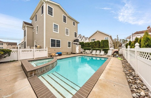 The luxury home located on the west side of Avalon Avenue at 2402 Avalon Ave. Avalon, NJ in the highly sought after beach community of Avalon. Located just 1 block from 24th Street beach. All 5 bathrooms and kitchen remodeled for 2023! Tom Welsh built 6 bedroom, 5 full bath single family home offers great proximity to everything. Beach and boardwalk is one block away, family recreation just 3 blocks away. Center of town and shopping 3 blocks away! The first floor has a family room with a wet bar, laundry room, bedroom with a king bed suite. Another bedroom with 2 single beds and a 3rd bedroom with 2 sets of custom built- in bunk beds (queen sizes on bottom and twin sizes on top) The second floor has remodeled kitchen, dining room, living room, a bedroom with queen bed, and a bedroom with two single beds. The third floor has a tastefully decorated master suite with a king bed....6 bedrooms in all! Heated pool and jacuzzi perfect after a day at the beach are well cared for with pool toys for your afternoon enjoyment. Sleeps 16. Custom bunk bed room with built in phone chargers that kids will love!❤️