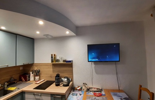 Living / kitchen with balcony facing south (very good sunshine) and views of the mountains, Mt Charvin. Ceramic hob, dishwasher, large fridge and freezer, microwave multifunction, plenty of storage space, sofa BZ, large flat screen TV, cleaning products and dishwasher included.