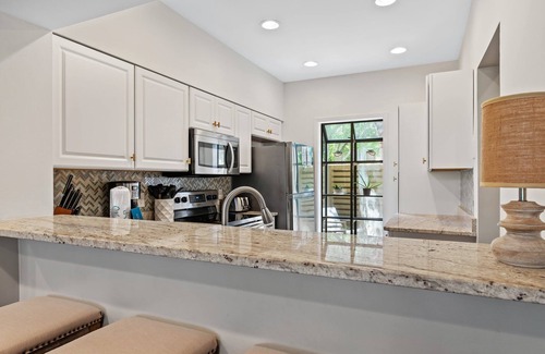 Step inside to find a bright, beach-inspired retreat designed for comfort. The open kitchen features modern stainless steel appliances and polished granite countertops, making meal prep a breeze. Whether gathering around the six-person dining table for a family meal or sipping coffee at the breakfast bar, you’ll feel right at home.