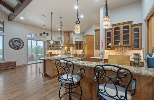 Bella Vista is the main house that can sleep up to 18 people (19 people if requested) in 7 bedrooms. This house is located near the river and has access to a newly constructed Infinity pool and hot tub. This house has a spacious living room and kitchen perfect for large group gatherings. The kitchen provides brand new state of the art appliances with a coffee bar. The house also includes a game room with a fully customized Texas themed pool table. Enjoy the large wrap around balcony which gives a view out to the beautiful Colorado river and overlooks the Infinity pool.